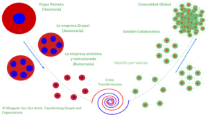 Los contenidos a continuación relativos al modelo de las 7 fases de desarrollo de las organizaciones, reproducen parcialmente el articulo «El Modelo de las Siete Fases a Distintos Niveles» de la web de Margarete Van Den Brink.